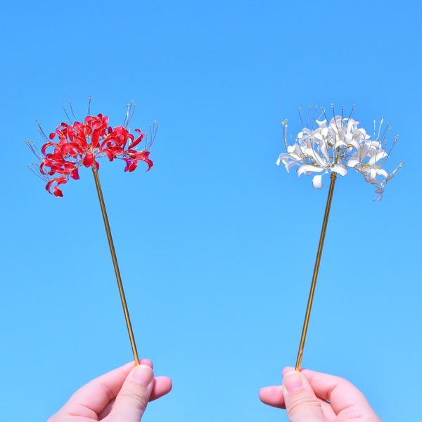 彼岸花や椿、桜など日本に咲く季節の花々をモチーフにしたかんざしやヘアクリップ、ピアス、イヤリングなどのアクセサリー