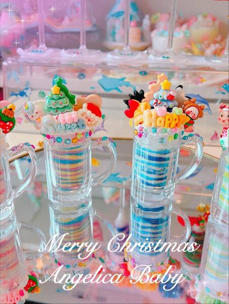 グラスにプロ用色砂を積み重ねて模様を作り、ホイップやパーツをデコれば可愛いパフェの完成です。